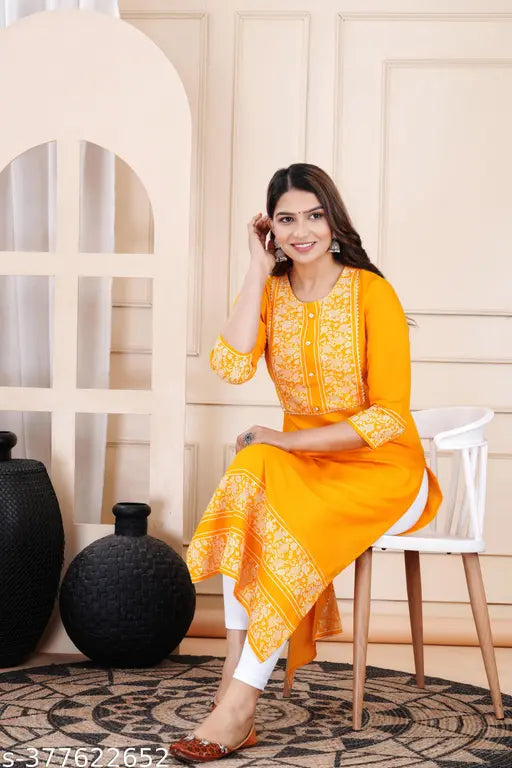 Women Rayon Ethnic Wear for Casual and Festive Occasions Gold Printed Straight Fit Kurti(Black) |Ethnic Kurti for Women|Kurtis & Kurtas |Simple & Party Wear Kurti|